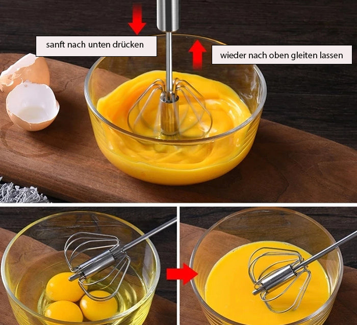 Durch die reibungslose Halbautomatik des in der Gastronomie schon lange zum Einsatz kommenden Schneebesens, funktioniert das Rühren und Mixen auch ganz ohne Elektrik wie im Handumdrehen. Kein lästiges Her- und Wegräumen mehr!